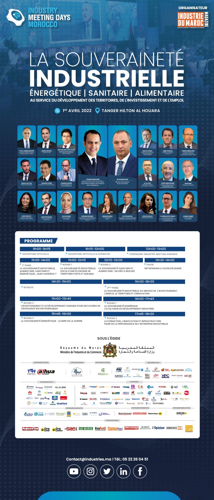 Il ne reste qu’une journée pour la 4º Edition de la Rencontre d’Affaires pour l’Industrie, l’Investissement et l’Innovation, « INDUSTRY MEETINGS DAYS MOROCCO » prévue pour demain, vendredi 1 avril 2022 sous le thème :