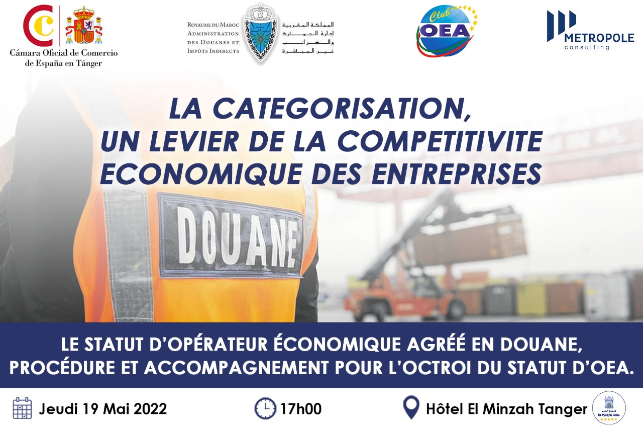 Nous sommes à J -2 du séminaire sur le Statut d’Opérateur Economique Agrée en douane-Statut d’OEA, organisé conjointement entre la Chambre Officielle de Commerce d’Espagne à Tanger, le Club des Opérateurs Economiques Agréés du Maroc et Metropole Consulting, en partenariat avec la Direction Régionale d’Administration des Douanes et Impôts Indirects de la Région de Tanger-Tétouan-Al Hoceima, qui aura lieu ce Jeudi 19 Mai 2022 à 17h00 à l’Hôtel El Minzah sous le thème :