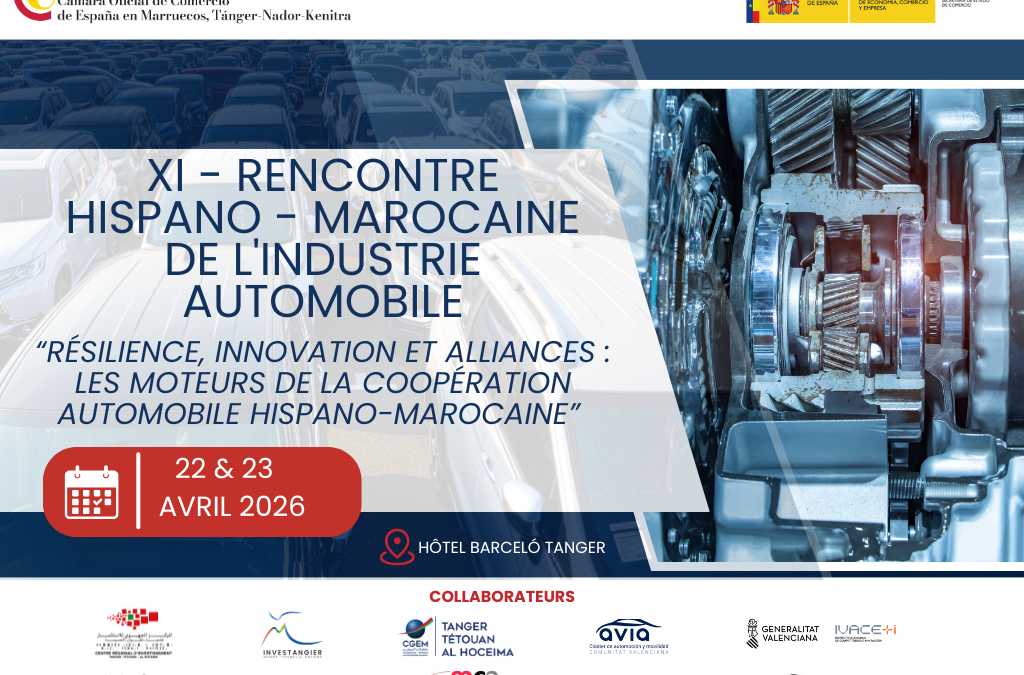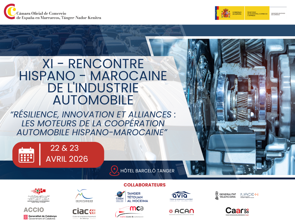 6 février 2026Dans un contexte de profonde transformation du secteur automobile, marqué par la réorganisation des chaînes de valeur, la transition industrielle et la recherche de partenariats stratégiques durables, la Chambre Officielle de Commerce d’Espagne au Maroc – Tanger, Nador, Kénitra a le plaisir de vous inviter à participer à la :